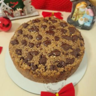 Torta com massa assada de farinha de aveia, castanha de caju, farinha de linhaça e chocolate vegano, e ainda recheada com creme de tâmaras e cacau
